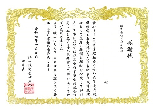 油山住宅管理組合様より感謝状を贈呈されました。